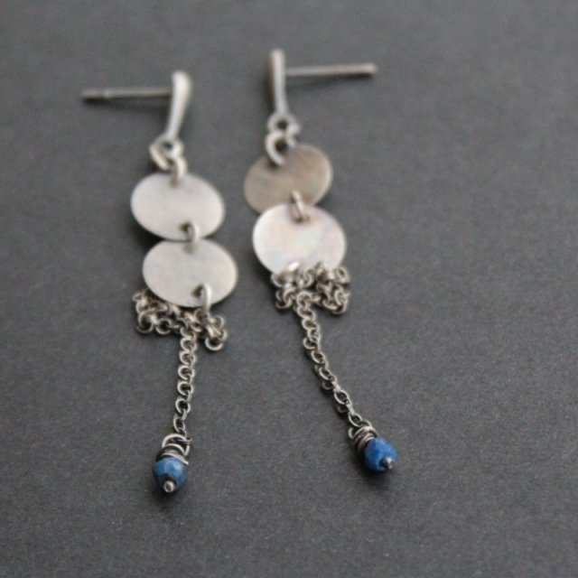Długie kolczyki wykonane zostały z oksydowanego srebra próby 925. Kamienie: fasetowane lapis lazuli (0,3 cm ). Bigle sztyfty. Długość całkowita kolczyków 9 cm.