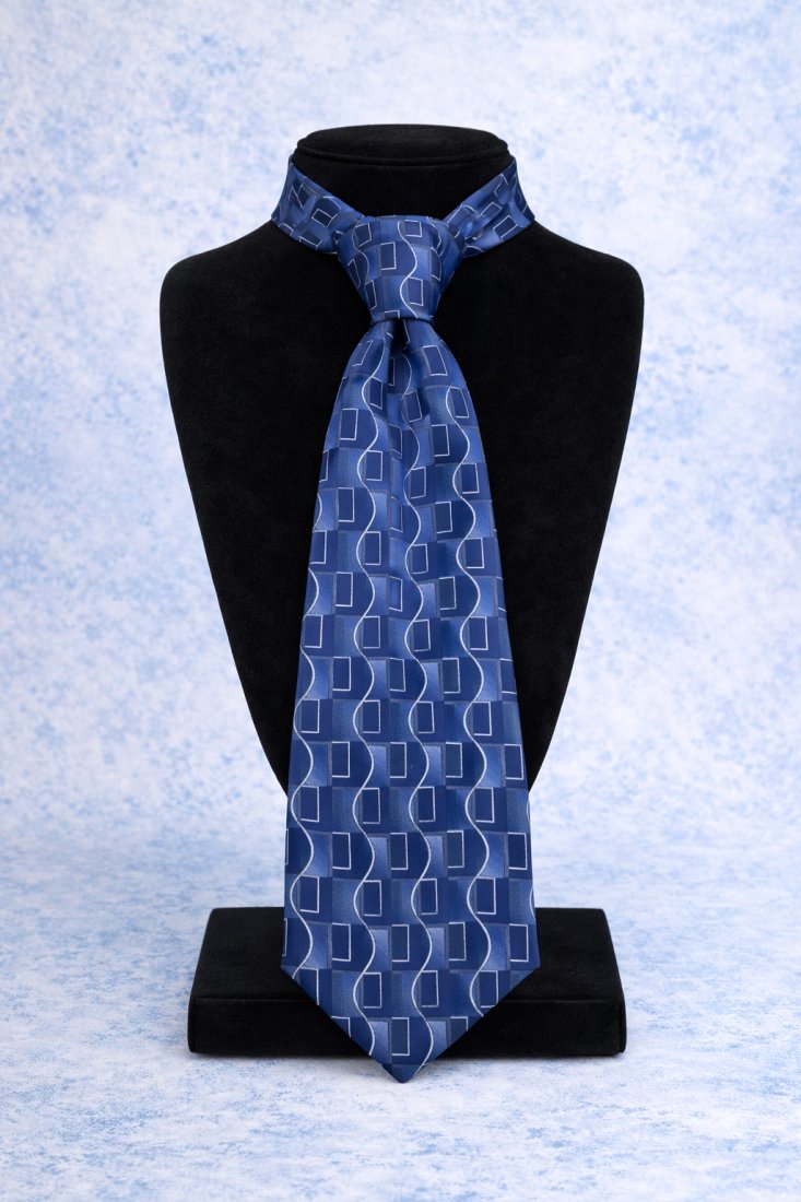 Elegancki krawat męski w odcieniu granatu z nowoczesnym, geometrycznym wzorem. Wyrafinowany motyw nadaje mu charakteru, a jednocześnie zachowuje ponadczasową klasę.