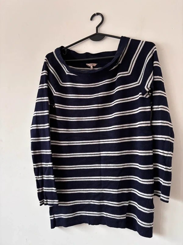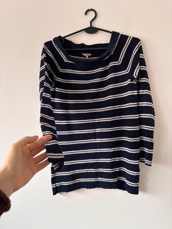 Granatowy sweter w białe paski marki EQUALO, w rozmiarze . Wykonany z miękkiej, elastycznej dzianiny,bardzo komfortowy w noszeniu.
