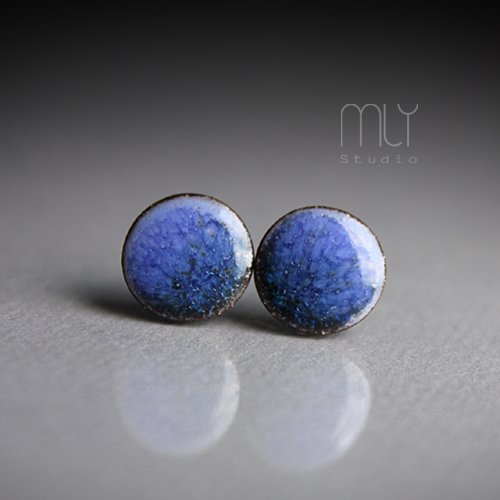Ceramiczne kolczyki w formie sztyftów, ręcznie wykonane z delikatnej czekoladowobrązowej gliny kamionkowej, jednostronnie szkliwione efektownym zielono błękitnym szkliwem z efektem plamek, na antyalergicznych sztyftach w kolorze srebrnym.Średnica ok. 11mm. Polecam