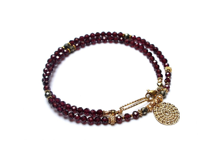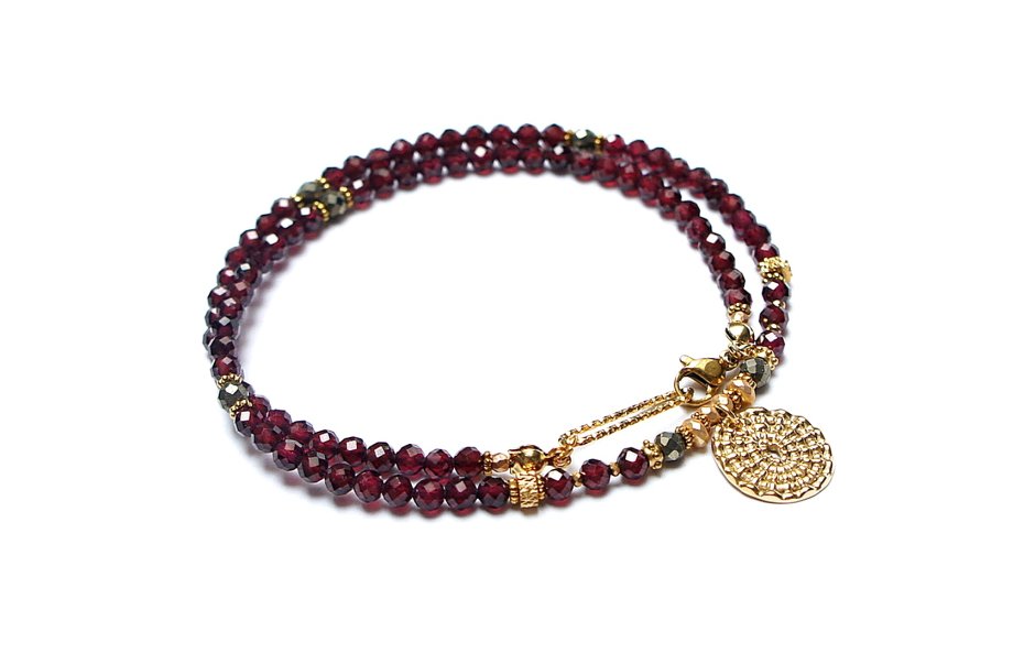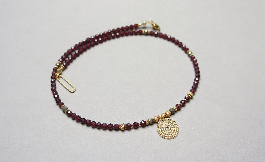 Krótki, delikatny naszyjnik wykonany w całości z pozłacanej stali szlachetnej oraz naturalnych, szlachetnych kamieni - fasetowane granaty [4mm], piryt fasetowany o surowym wyglądzie [4mm], hematyt fasetowany, platerowany [2mm i 3mm], przekładek z hematytu [1mm]. Naszyjnik o długości ok. 43cm.
