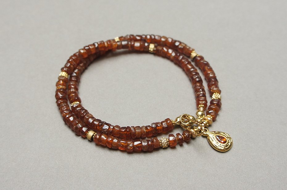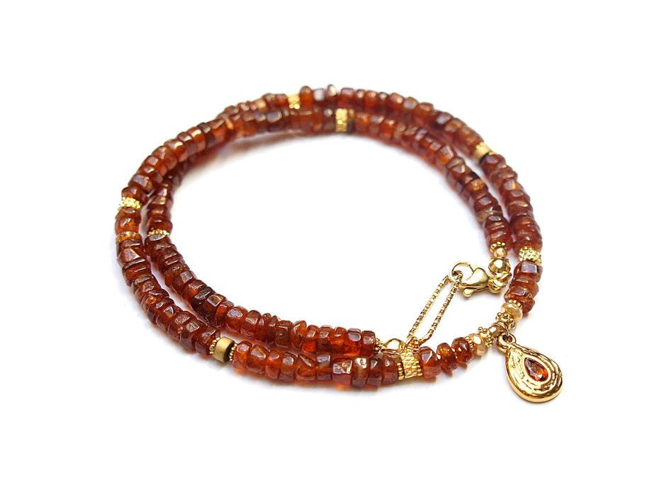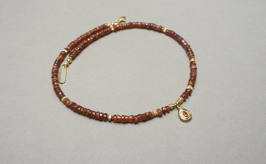 Krótki naszyjnik wykonany w całości z pozłacanej stali szlachetnej oraz naturalnych, szlachetnych kamieni - talarki nieregularnego granatu hessonit [4,5 x 2-3mm], talarków matowego hematytu [4 x 2mm], oponek fasetowanego, platerowanego hematytu [3x2mm], przekładek z hematytu [1mm]. Naszyjnik o długości ok. 42cm.