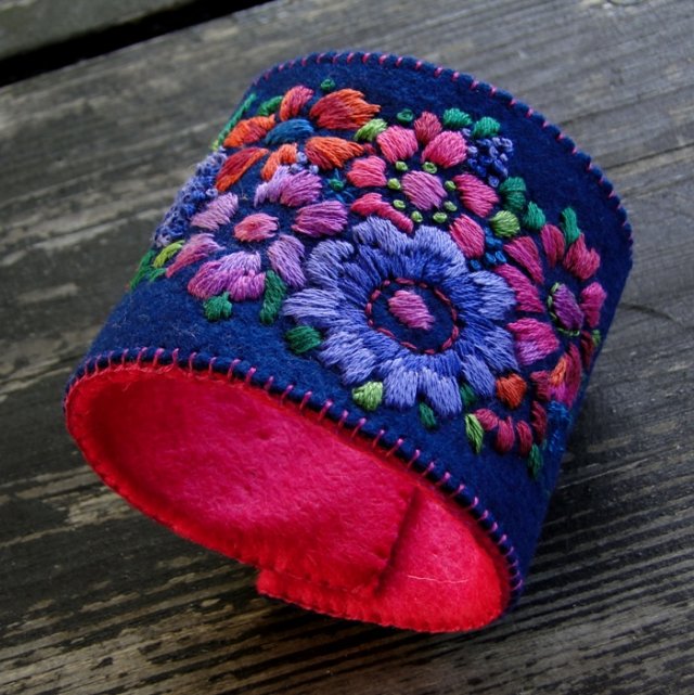 Przepiękna ( ładniejsza niż na zdjęciu) bransoleta, szeroka, ozdobna, a lekka i wygodna. Wykonana ręcznie haftem płaskim... Bazę stanowi gruby, mięsisty, trwały filc - przyjemny w dotyku. Bardzo wygodne zapięcie: koralik i pętelka z gumki. Wymiary: szerokość ok. 6,5 cm - na nadgarstek 15 -18 cm ( możliwość dokładnego wyregulowania poprzez przeszycie koralika).