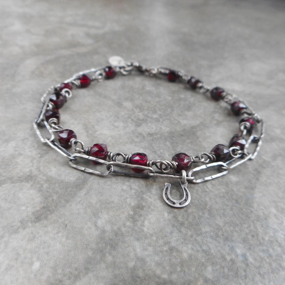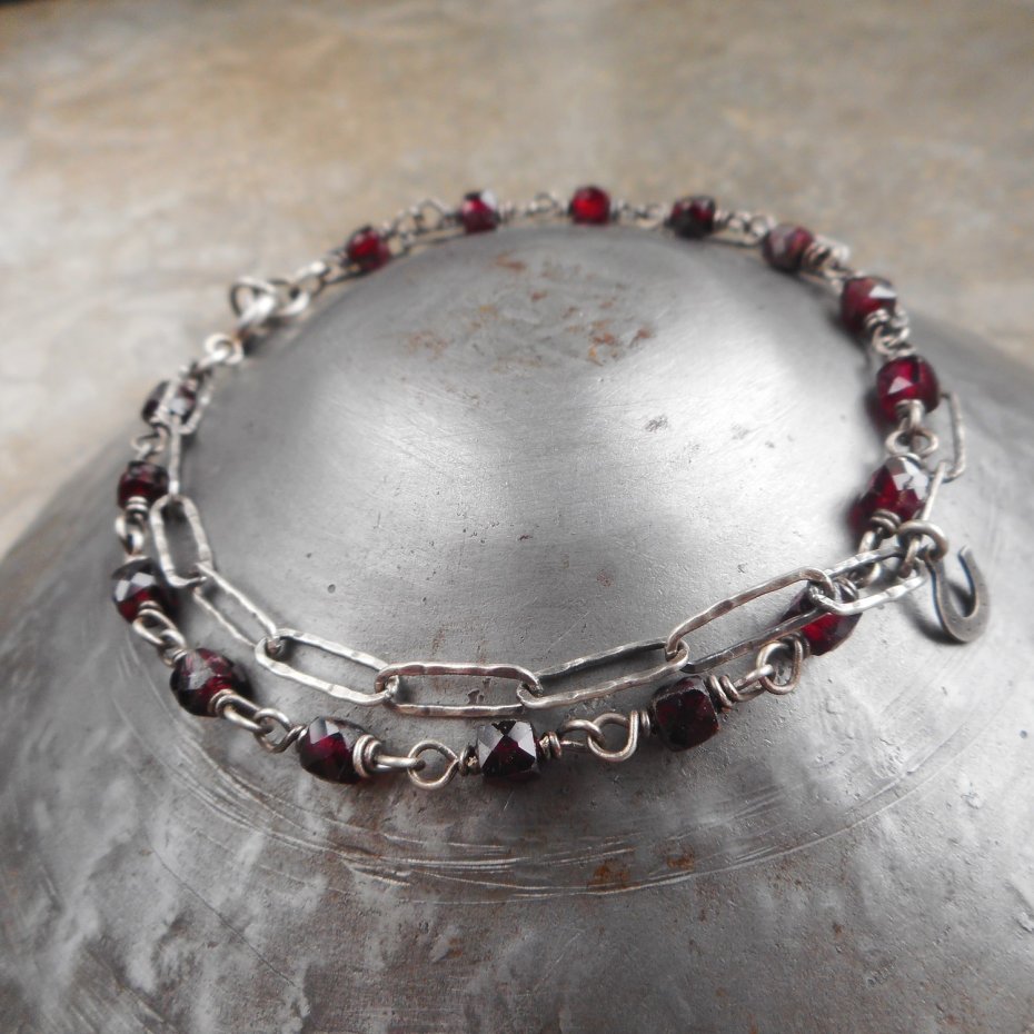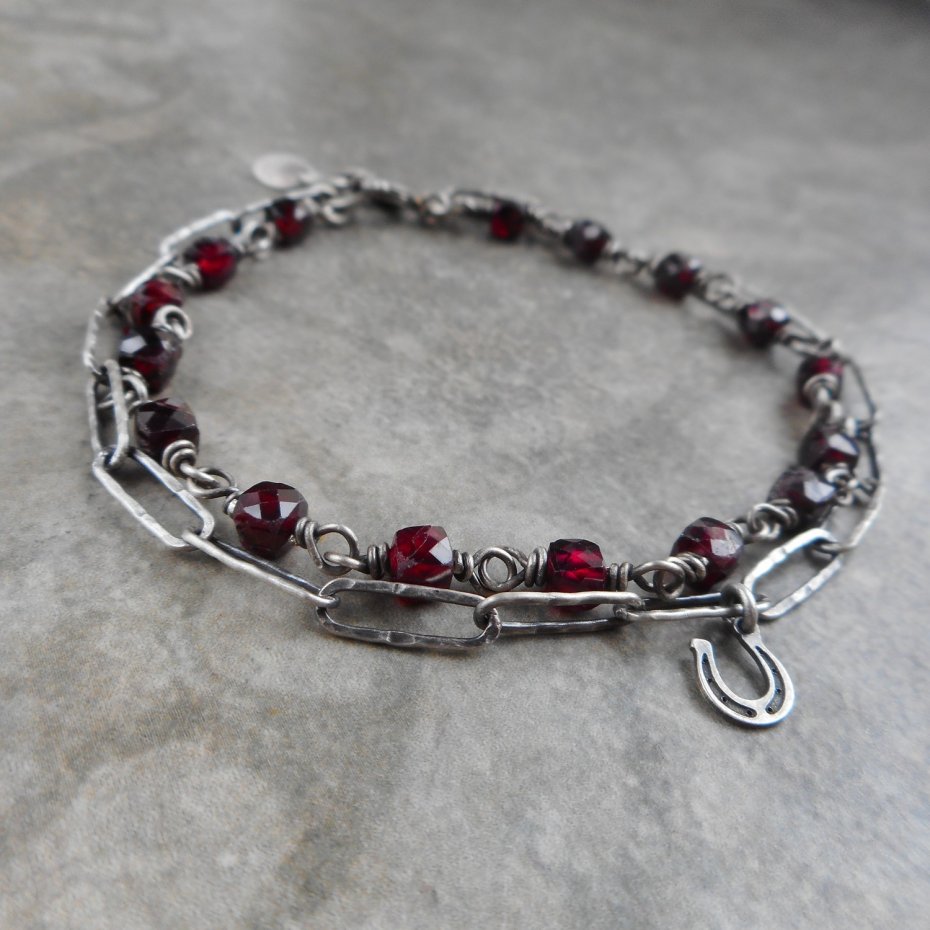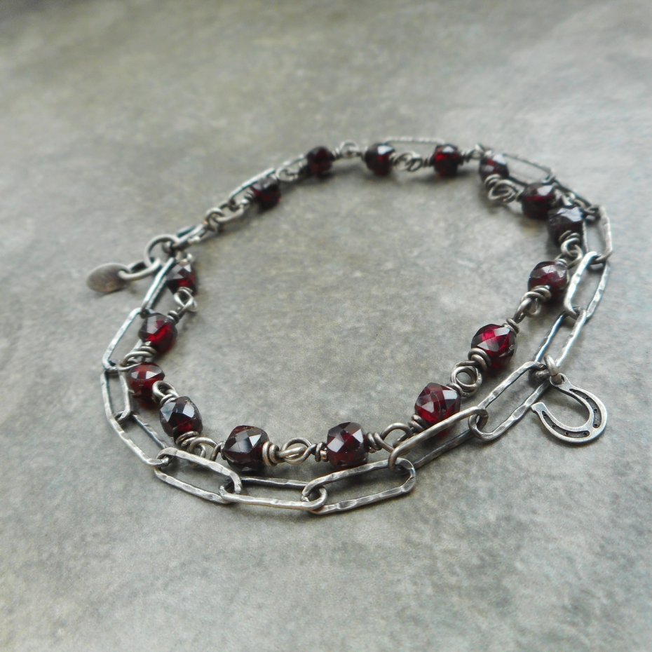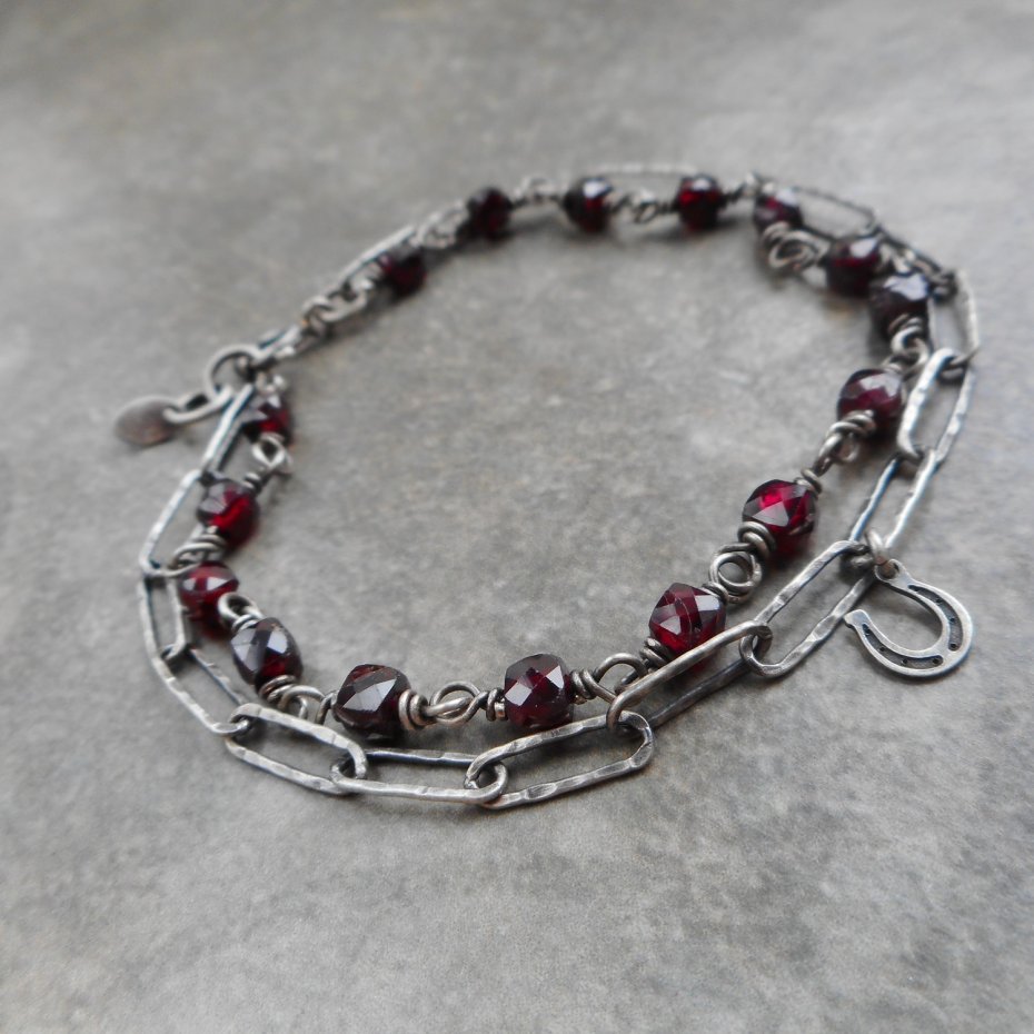Bransoletka wykonana ze szlachetnego srebra i kamieni naturalnych; lekka i efektowna, w pięknym burgundowym kolorze.