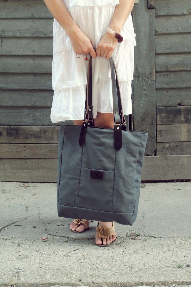 Duża, pojemna i wygodna torba wykonana ze mocnej bawelnianej tkaniny oraz skory naturalnej( raczki) Wewnątrz znajduje sie podszewka w groszki z dwiema kieszonkami. Torba zapina sie na zamek. Z przodu, na zewnatrz jest dodatkowa kieszonka.
