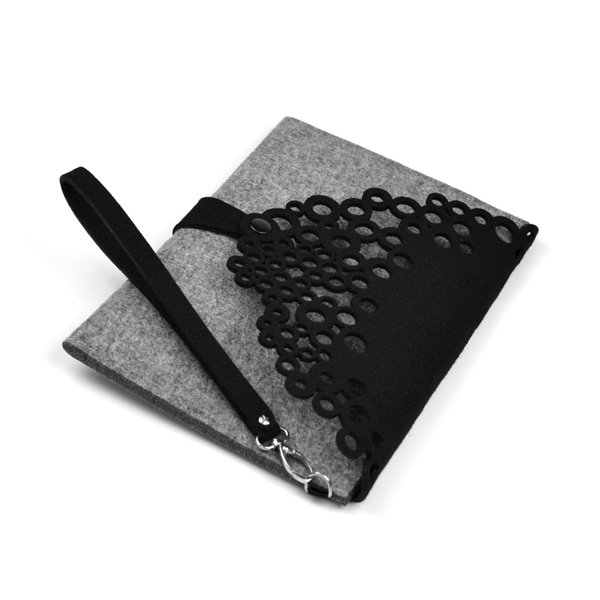 prostokątna torebka z szarego i czarnego filcu z ażurową aplikacją wycinaną laserowo