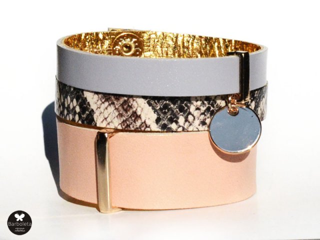 Zestaw trzech bransoletek w oryginalnym zestawieniu kolorystycznym. Pudrowa barwa - nude oraz odcień jasnej, gołębiej szarości skontrastowany ze wzorem gada Bransoletki wykonane są z wysokiej jakości włoskich skór naturalnych. Zapinane na metalowe zatrzaski. Obwód 17cm po zapięciu. Wysokiej jakości elementy metalowe w kolorze złota, nie ulegają wytarciu. Lekkie i wygodne. Opatrzone metką projektanta. Możliwość zamówienia w innym rozmiarze. W zależności od ustawień monitora, kolory w rzeczywistości, mogą nieznacznie różnić się od przedstawionych na zdjęciu. © wzór chroniony prawem autorskim