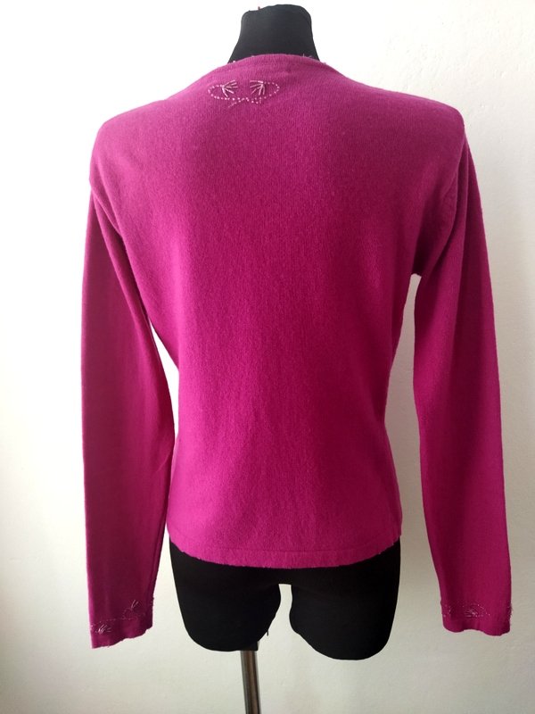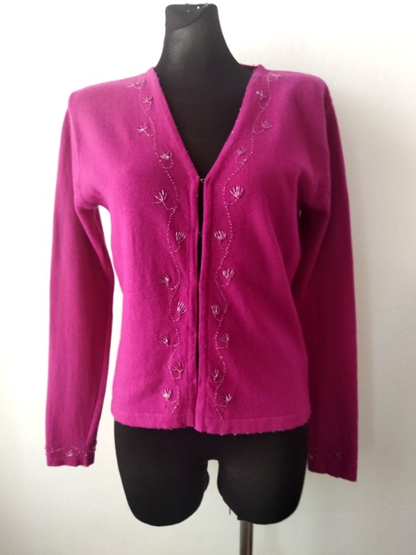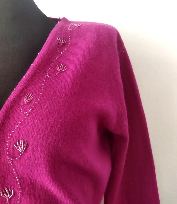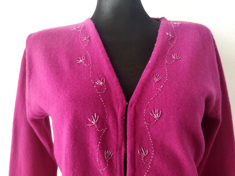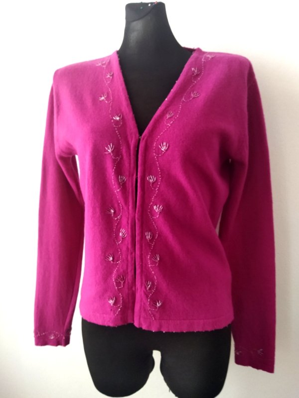 Wełniany sweterek typu kardigan w biskupim kolorze zdobiony koralikowym haftem