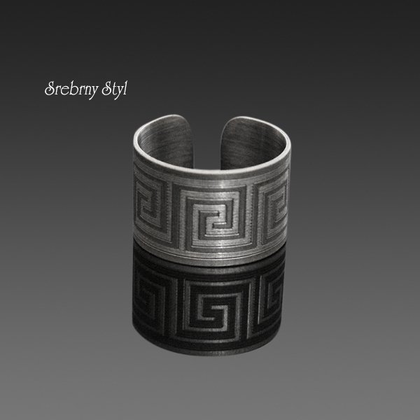 Szeroka, minimalistyczna autorska obrączka ozdobiona wygrawerowanym wzorem w stylu greckim. Obrączkę wykonaliśmy w taki sposób aby jej tył był mocno zaokrąglony, co znacznie zwiększa komfort jej noszenia. Srebro oksydowane aby podkreślić wygrawerowany wzór oraz satynowane na mat. Surowa ale ciekawa forma. Do kompletu można dokupić bransoletkę.
