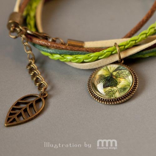 Bransoletka z możliwością noszenia jako naszyjnik, to bardzo romantyczne, nostalgiczne i kobiece malutkie dzieło sztuki. Obrazek pod szkiełkiem to autorska ilustracja. Bransoletka z kilku rzemieni prezentuje się wspaniale, a zawieszka oraz medalion dopełniają romantyczną stylistykę .