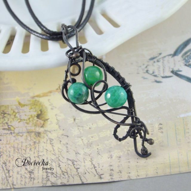 Wisior został stworzony z pięknych agatów misternie oplecionych miedzią. Miedź patynowana na ciemny kolor i polerowana.