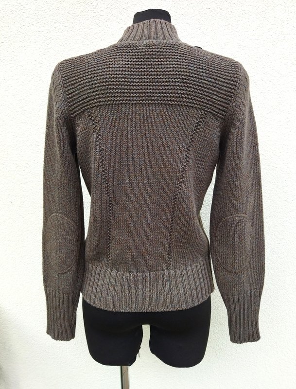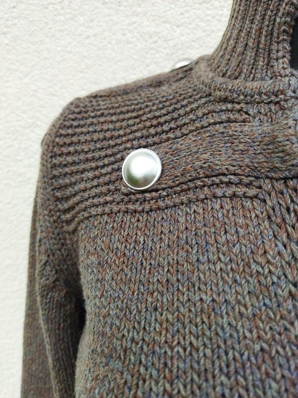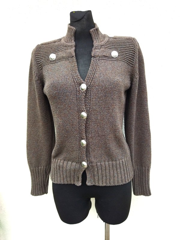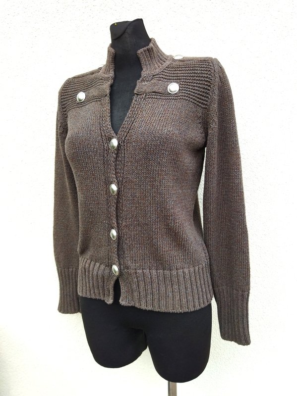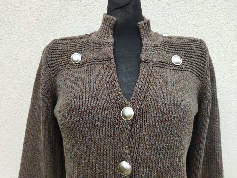 Krótki sweter w militarnym stylu z bawełniano-akrylowej włóczki w melanżowej kolorystyce zieleni, szarości i brązu .Żzapinany na guziki w rebrnym kolorze. Wykończony ściągaczami