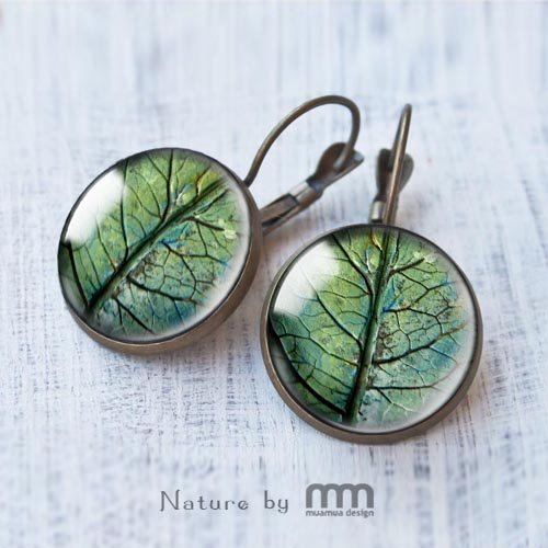 Kolczyki Green Leaf to bardzo kobiece i malutkie dzieła sztuki, które łączą nowoczesność z odrobiną antycznego powiewu. Obrazki pod szkiełkiem to fotografia autorskiej skulptury liścia.