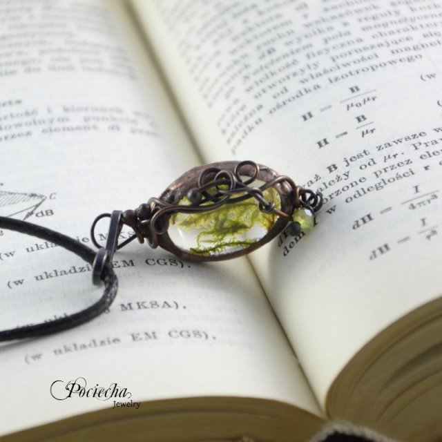 Wisior stanowi połączenie miedzi jubilerskiej ekologicznej cyny ( bez ołowiu ! ) ze szkłem w którego wnętrzu zamknęłam piękne naturalne suszony mech naturalny. Uroku dodaje zawieszka ze szklanym kryształkiem