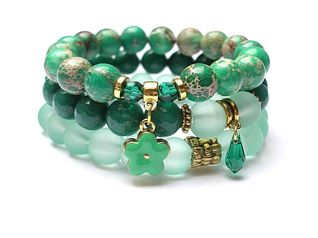 PROJEKT AUTORSKI. WSZELKIE INNE PODOBNE MODELE TO KOPIE NARUSZAJĄCE PRAWA AUTORSKIE. Komplet trzech bransoletek wykonanych z naturalnych kamieni: jadeit fasetowany [10mm], jaspis cesarski [10mm], szkło matowe [10mm], kryształki Swarovskiego [6mm], przywieszki z kryształkiem Swarovskiego w kształcie kropli [Emerald] oraz elementów metalowych w kolorze złota. Bransoletki pasują na nadgarstek 16 - 17cm. Biżuteria ozdobnie zapakowana