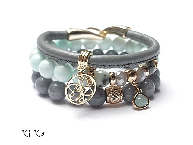 Komplet trzech bransoletek wykonanych z naturalnych kamieni - marmur [10mm], jadeity [10mm],jaspisów [10mm] ,kryształków [8mm] ,zawieszki w okuciu skórzanego rzemienia ze skórki cielęcej [6mm] oraz elementów metalowych w kolorze tzw. różowego złota. Bransoletki z kamieni na gumce silikonowej. Pasują na nadgarstek 16-17cm. W przypadku zmiany rozmiaru bransoletek prosimy o wcześniejszy kontakt. Biżuteria ozdobnie zapakowana.