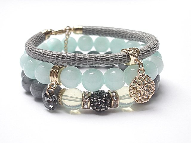 PROJEKT AUTORSKI. WŁASNOŚĆ KI-KA. KOPIOWANIE ZABRONIONE. Komplet trzech bransoletek wykonanych z naturalnych kamieni - marmur [10mm], jadeity [10mm], szklanych kuleczek [10mm], przekładki shamballa wysadzanej kryształkami Swarovskiego, przywieszki z kryształkiem Swarovskiego, skórzanego rzemienia ze skórki cielęcej o wężowym wzorze [śr. 5mm] oraz elementów metalowych w kolorze tzw. różowego złota. Bransoletki z kamieni na gumce silikonowej. Pasują na nadgarstek 16-17cm. W przypadku zmiany rozmiaru bransoletek prosimy o wcześniejszy kontakt. Biżuteria ozdobnie zapakowana.