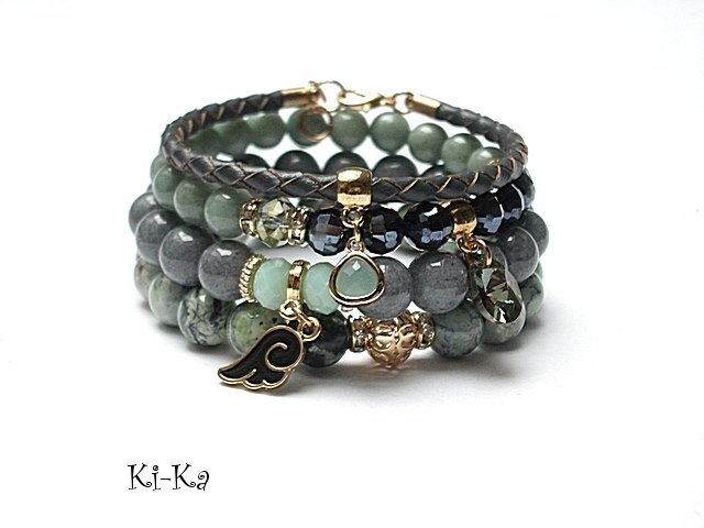 Komplet czterech bransoletek wykonanych z naturalnych kamieni: jadeity [10 mm i 8mm], jaspisy [10mm] ,kryształków [8mm] ,zawieszki z kryształka Swarovskiego [12mm] efektownej zawieszki w okuciu , naturalnego skórzanego rzemienia oraz elementów metalowych w kolorze tzw. różowego złota. Bransoletki pasują na nadgarstek 16-17cm. Biżuteria ozdobnie zapakowana