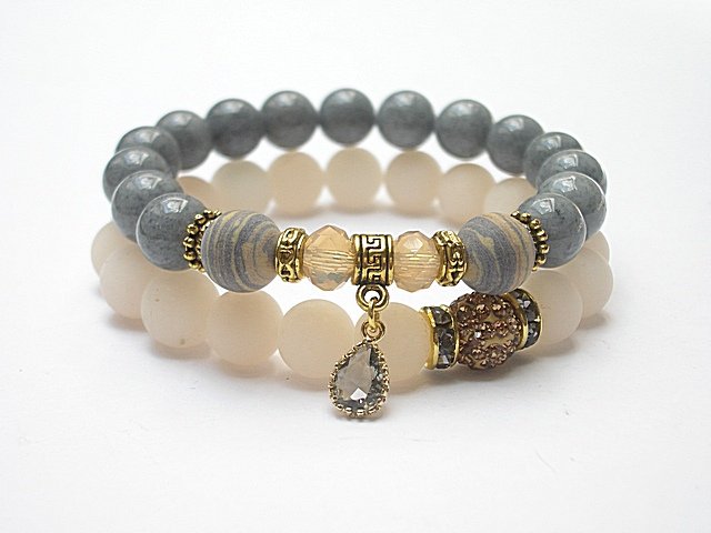 PROJEKTY AUTORSKIE. WŁASNOŚĆ KI-KA. KOPIOWANIE ZABRONIONE. Komplet dwóch bransoletek wykonany z naturalnych kamieni - agaty matowe [10mm], marmur [10mm], turkus prasowany matowy [10mm], kryształków fasetowanych [8 x 6mm], przekładki shamballa wysadzanej kryształkami Swarovskiego, efektownej, koronkowej zawieszki ze szkła oraz elementów metalowych w kolorze tzw. różowego złota. Bransoletki na gumce silikonowej. Pasują na nadgarstek 16-17cm. Biżuteria ozdobnie zapakowana. Możliwość dopasowania bransoletki do nadgarstka - wcześniej prosimy o kontakt.
