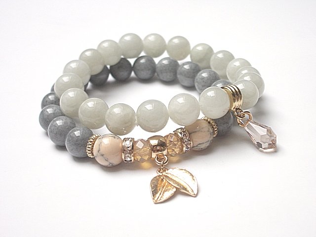 Komplet dwóch bransoletek wykonany z naturalnych kamieni - jadeity [10 mm], howlity [10mm], kryształków fasetowanych [ 8mm], zawieszki z kryształka Swarovskiego oraz elementów metalowych w kolorze złota . Bransoletki na gumce silikonowej. Pasują na nadgarstek 16-17cm. Biżuteria ozdobnie zapakowana