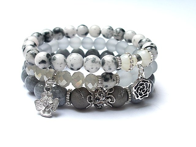Komplet trzech bransoletek wykonanych z naturalnych kamieni: jadeity [10mm],wyselekcjonowane dwie kuleczki druz agatów [ 10mm] ,agaty wysadzane cyrkoniami [8mm] ,jadeity [8mm] ,szklane matowe kuleczki [8mm] ,kryształki [8mm] ,przekładka z cyrkoniami oraz elementów metalowych w kolorze srebrnym. Bransoletki pasują na nadgarstek 15 - 16,5cm. Biżuteria ozdobnie zapakowana.