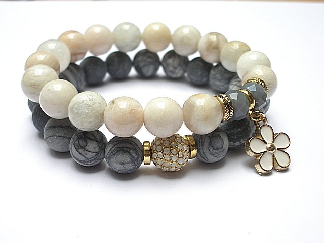 PROJEKT AUTORSKI. WSZELKIE INNE PODOBNE MODELE TO KOPIE NARUSZAJĄCE PRAWA AUTORSKIE. Komplet dwóch bransoletek wykonany z naturalnych kamieni - kuleczki kamienia księżycowego [10mm], jaspisu [10mm], kryształków [8 x 10mm], ekskluzywnej przekładki wysadzanej cyrkoniami [10mm] oraz elementów w kolorze złota. Bransoletki na gumce silikonowej. Pasują na nadgarstek 16-17cm -możliwość dopasowania. Biżuteria ozdobnie zapakowana.