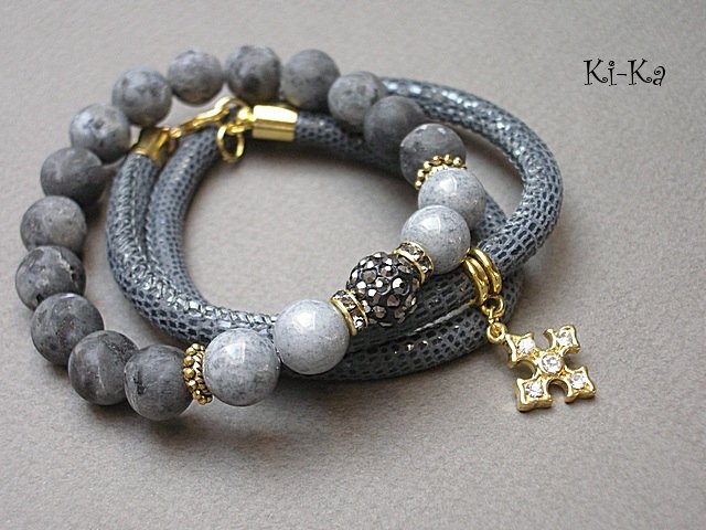 Komplet dwóch bransoletek wykonanych z kul naturalnych kamieni - matowe kuleczki larvikitu [10mm] , marmur [10mm] ,kuleczki shamballa wysadzanej kryształkami Swarovskiego [10mm], rzemienia z naturalnej skórki, oraz elementów metalowych w kolorze złota. Bransoletki pasują na nadgarstek 16-17cm. Biżuteria ozdobnie zapakowana.