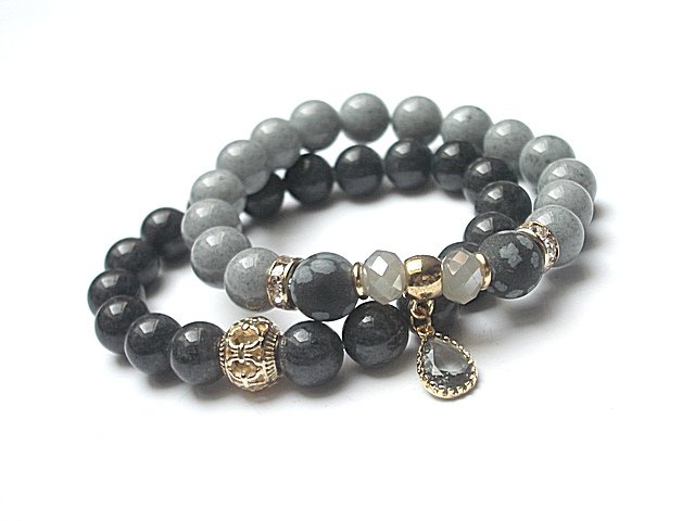 Komplet dwóch bransoletek wykonany z naturalnych kamieni - marmur [10 mm], obsydian [10mm], kryształków fasetowanych [8 x 6mm], zawieszki ze szkła w koronkowej oprawie oraz elementów metalowych w kolorze różowego złota . Bransoletki z kamieni na gumce silikonowej. Pasują na nadgarstek 16-17cm. Biżuteria ozdobnie zapakowana