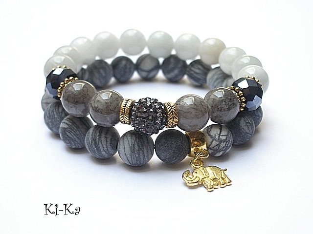 Komplet dwóch bransoletek wykonanych z naturalnych minerałów: jaspis matowy [10mm], marmur [10mm], jadeity [10mm], kryształków [8 x 10mm], przekładki shamballa wysadzanej kryształkami Swarovskiego oraz elementów w kolorze złota. Bransoletki na gumce silikonowej. Bransoletki będą pasowały na nadgarstek 15,5-16,5cm