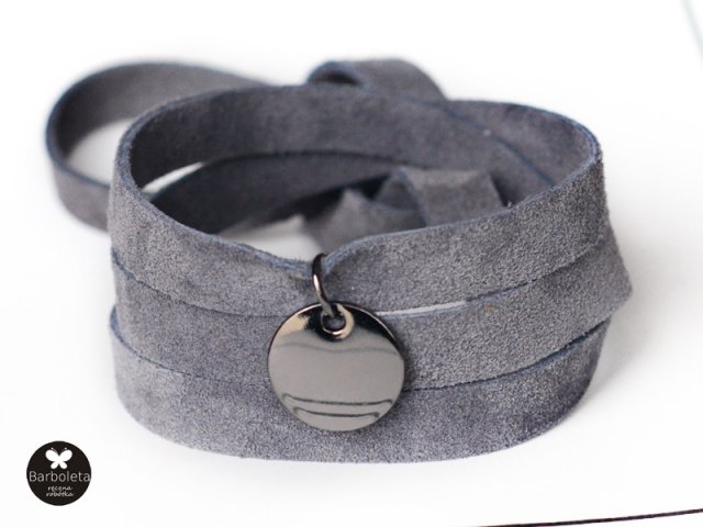 Bransoletka typu zamotka wykonana z wysokiej jakości skóry naturalnej mięciutkiej,zamszowej w odcieniu szarości. Ozdobiona przywieszką metalową w kolorze grafitowym.