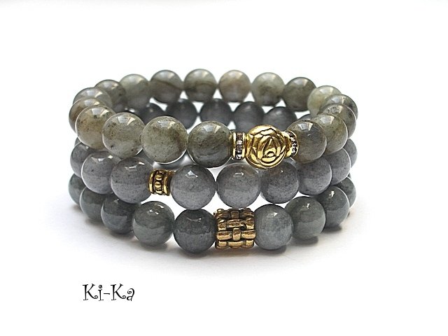 Komplet trzech bransoletek wykonanych z naturalnych kamieni: jadeity [10mm], marmur [10mm], labradoryty [10mm] oraz elementów metalowych w kolorze złotym. Bransoletki pasują na nadgarstek 16-17cm. Biżuteria ozdobnie zapakowana.