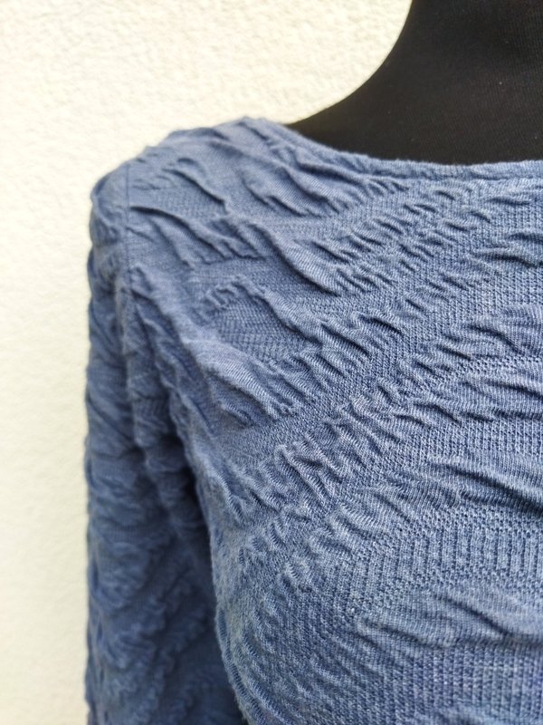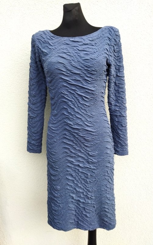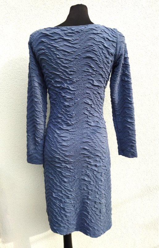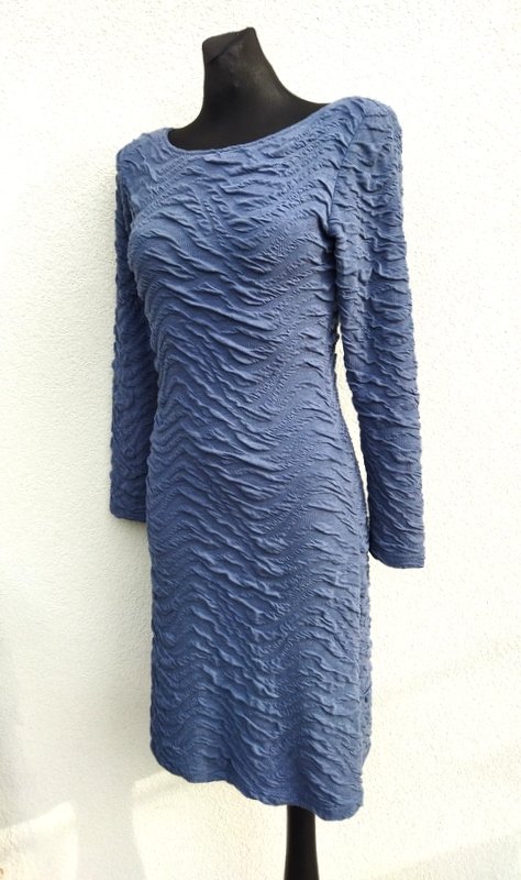 Ołówkowa sukienka z rozciągliwej tkaniny dzianinowej w szarym kolorze z przestrzenną fakturą . Taliowana, z owalnym dekoltem. Wkładana przez głowę - bez zamka. Miła, podatna i bardzo wygodna