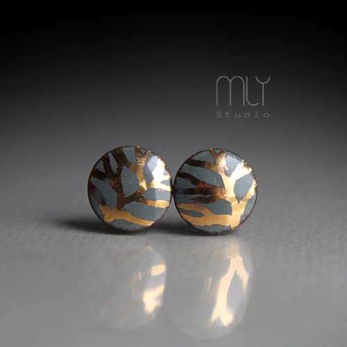 Ceramiczne okrągłe kolczyki w formie sztyftów, ręcznie wykonane z delikatnej czekoladowobrązowej gliny kamionkowej, jednostronnie szkliwione mieszanką szarych szkliw z efektem plamek, na antyalergicznych sztyftach w kolorze srebrnym. Średnica ok. 9mm. Polecam