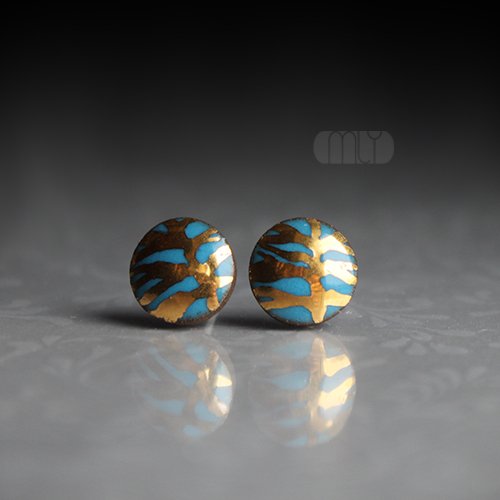 Ceramiczne okrągłe kolczyki w formie sztyftów, ręcznie wykonane z delikatnej czekoladowobrązowej gliny kamionkowej, jednostronnie szkliwione mieszanką błękitnych szkliw z efektem plamek, na antyalergicznych sztyftach w kolorze srebrnym. Średnica ok. 9mm. Polecam