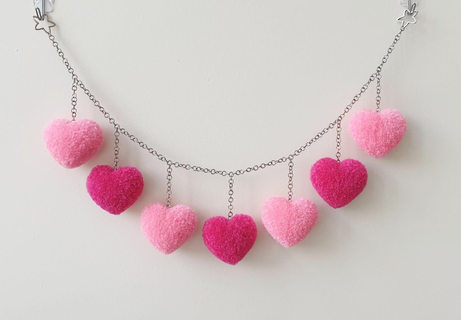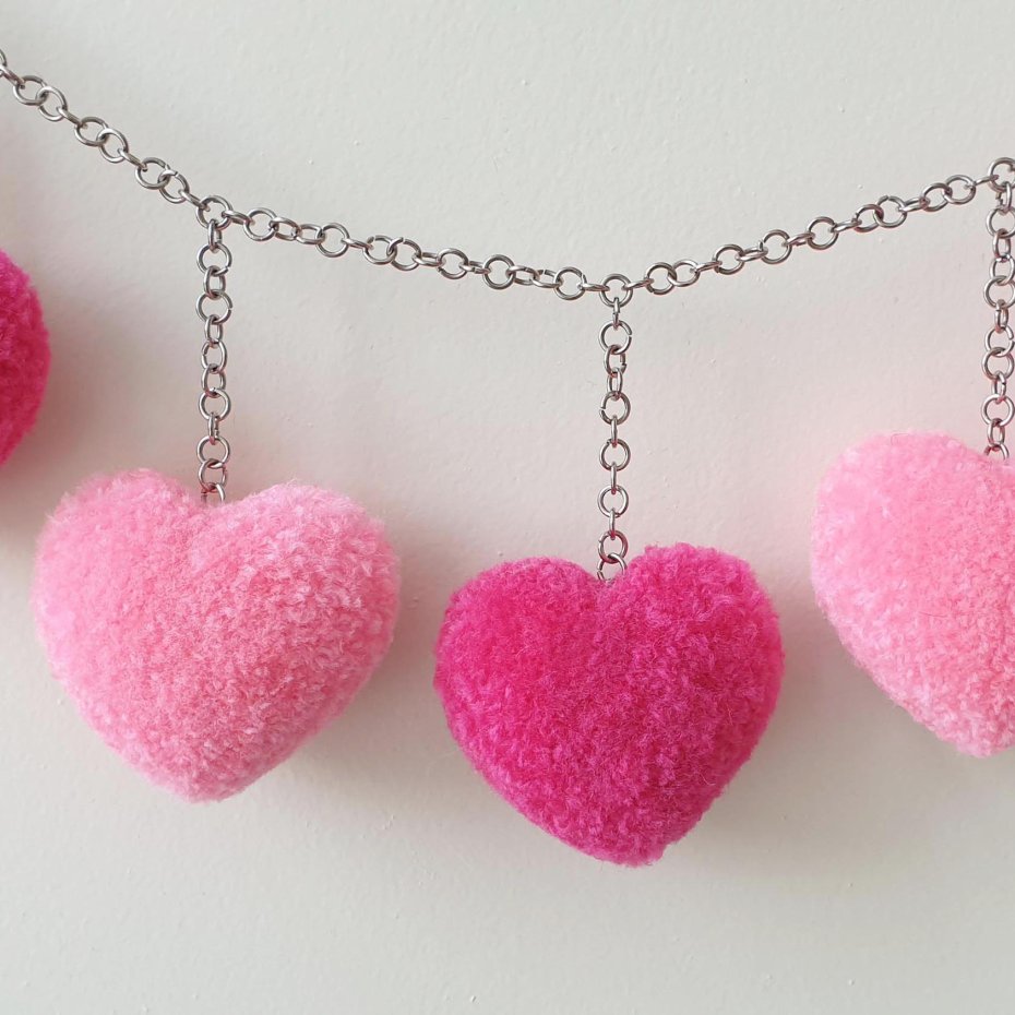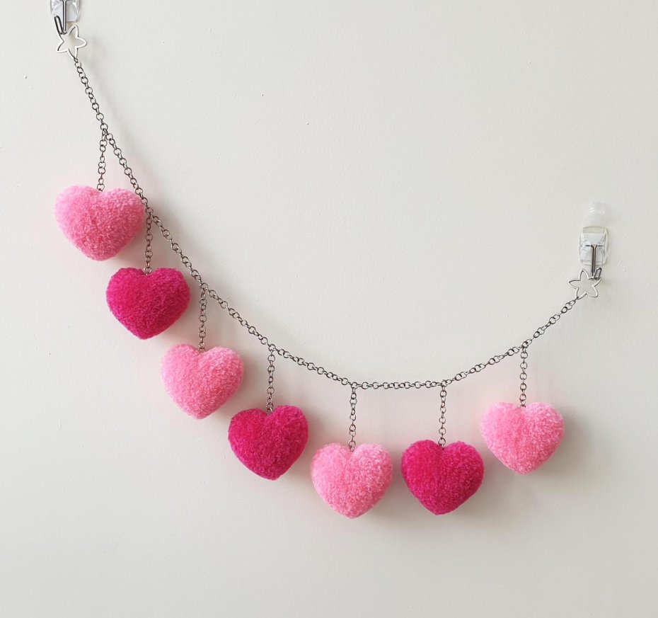 Delikatna girlanda z różowych pomponów w kształcie serc to urocza dekoracja do pokoju dziecięcego oraz idealny akcent walentynkowy. Pompony zawieszone na lekkim łańcuszku tworzą subtelną, romantyczną ozdobę, która pięknie dopełni wnętrze i doda mu ciepła.