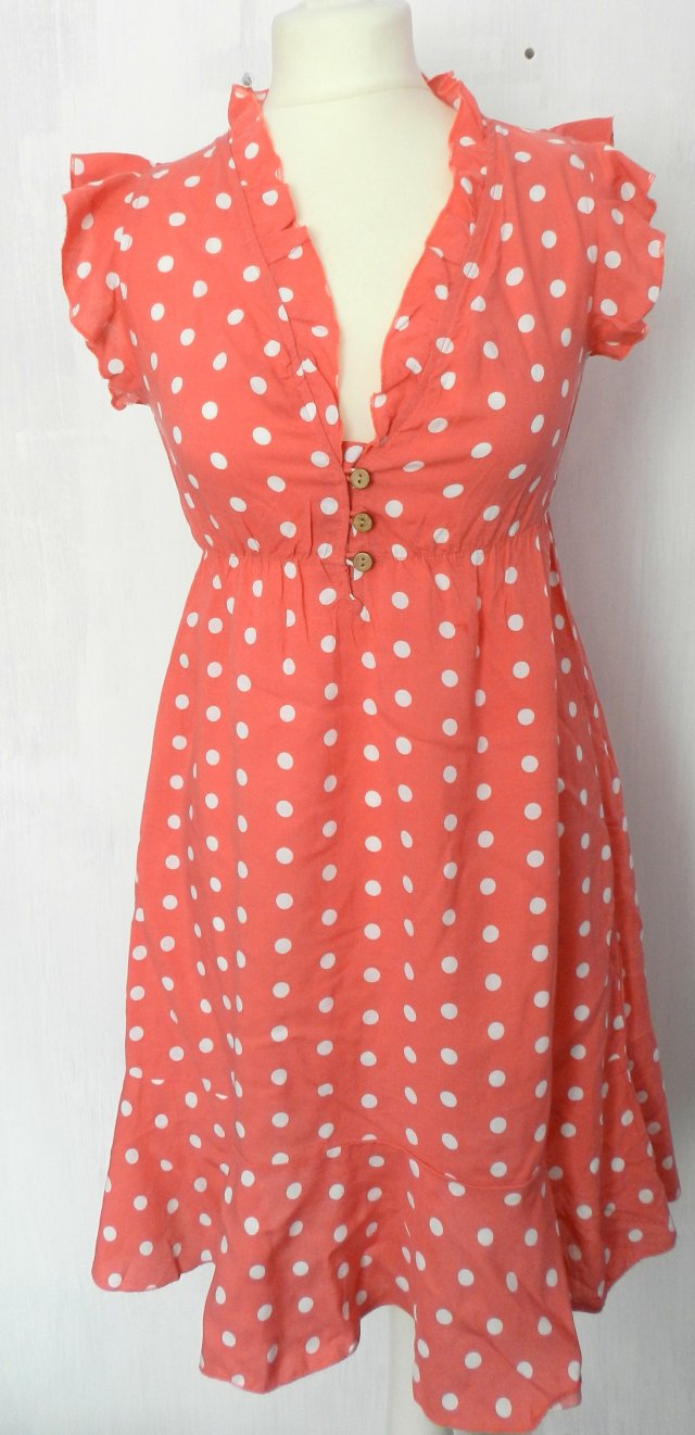 Klasyczna sukienka w grochy z dekoltem w serek wykończonym drewnianymi guziczkami