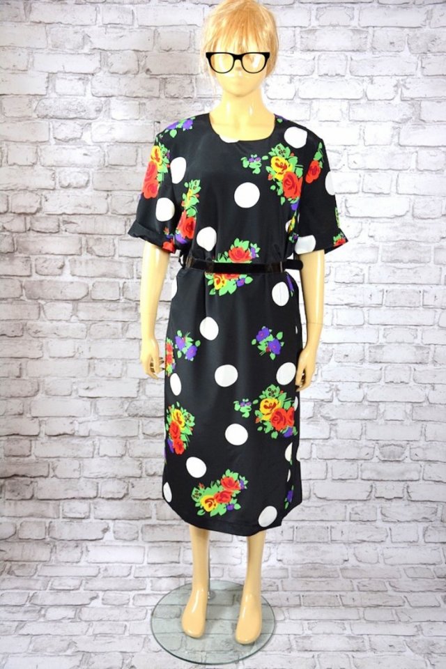 WYPRZEDAŻ.Efektowna sukienka w stylu retro w duże białe grochy w towarzystwie kolrowych kwiatów, sukienka o luźniejszym fasonie do regulacji w pasie (pasek plus szlufki),z tyłu zapięcie na suwak.Całość na podszewce.