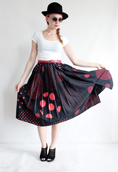 Spódnica w grochy wykonana z poliestru. W talii wszyta guma.
