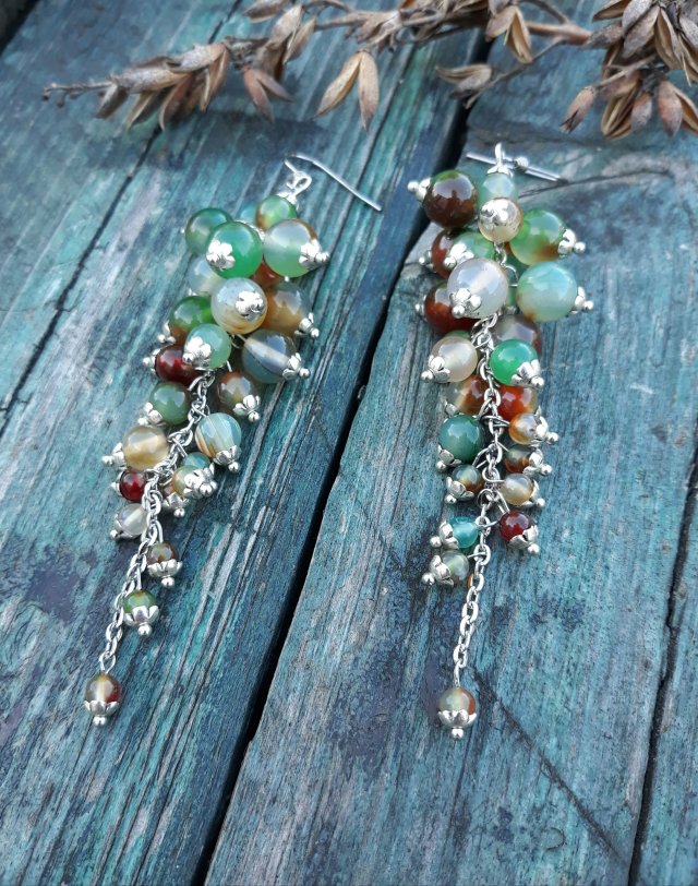 ,,gronka,, to kolorowe kolczyki wykonane z tropikalnego agatu w rozmiarze 4mm,5mm i 8mm, z dodatkiem metalowych elementów. Kolczyki zawieszone są na klasycznych biglach wykonanych ze stali szlachetnej.