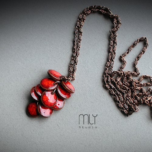 Podłużny ceramiczny wisior, ręcznie wykonany z delikatnej gliny kamionkowej, elementy jednostronnie szkliwione efektowną mieszanką błyszczących intensywnie czerwonych szkliw z efektem plamek , zawieszony na miedzianym łańcuszku o efektownym splocie. Długość zawieszki ok. 5cm, długość łańcuszka 2x28cm. Polecam