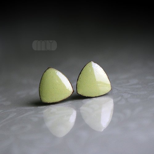 Ceramiczne kolczyki w formie sztyftów, ręcznie wykonane z delikatnej gliny kamionkowej, jednostronnie szkliwione mieszanką zielonych szkliw z efektem plamek i subtelnym połyskiem, na antyalergicznych sztyftach w kolorze srebrnym.Średnica ok. 10mm.. Polecam
