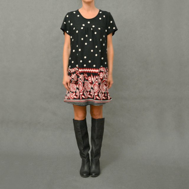 Dzianinowa sukieneczka w groszki i piękny wzór na dole. Z dwoma malutkimi kieszonkami.