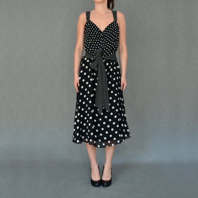 Czarna sukienka w groszki różnej wielkości. Wiązana w talii. Dół szerszy. Materiał to żorżetowa wiskoza. Na podszewce. Marka NEXT.
