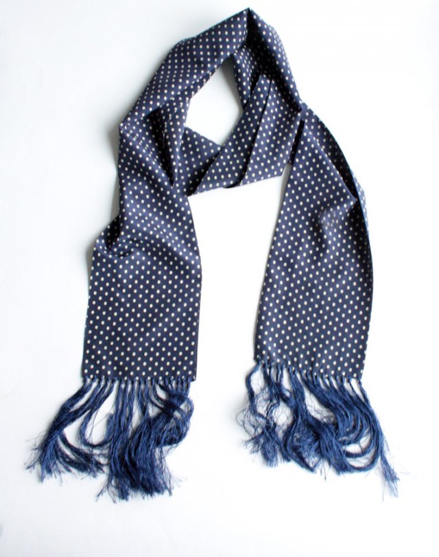 Podwójnie zszywany szal w kremowe groszki na granatowym tle. Piękne wykończenie gęstymi frędzlami.