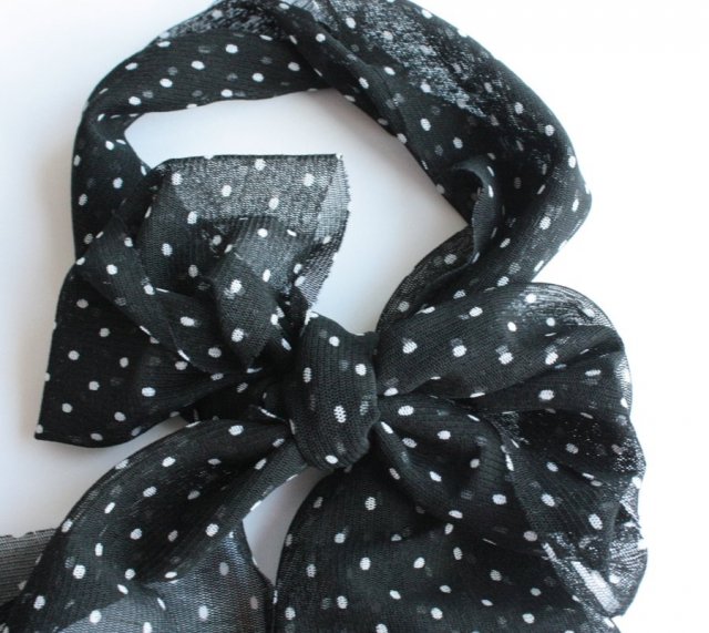 Cienki szal w groszki z materiału przypominającego elastyczny tiul. Surowe wykończenie (bez obszycia, nie strzępi się).