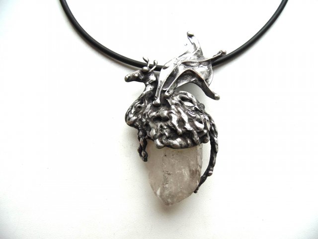 Wisiorek wykonany z miedzi, cyny i surowego kryształu górskiego. Zawieszony na czarnej lince kauczukowej o długości ok. 45 cm. Wymiary max ok. 7,5 na 4 cm.