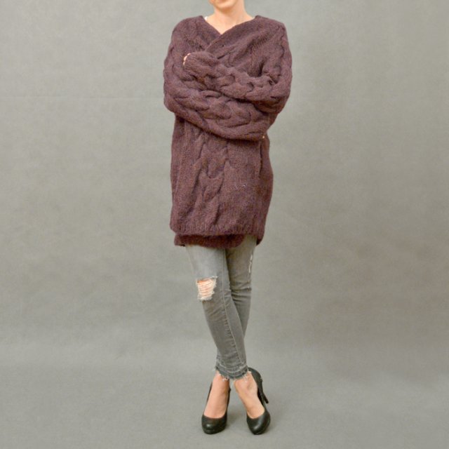 Świetny sweter. Grubasek, że ho ho...A jaki ciepły, spokojnie zastąpi niejeden płaszcz. W grube warkocze, z kieszeniami po bokach. Nie zapinany. Włochaty, gryzak ale wiadomo, że na skórę się go nie nosi.