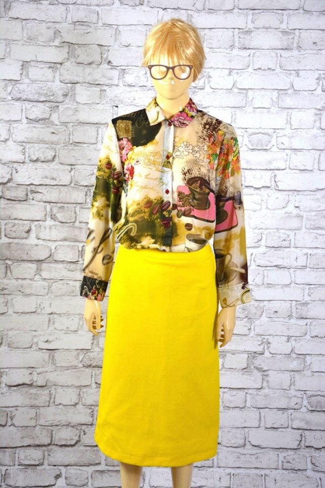 Świetna kanarkowa spódnica vintage o długości delikatnie za kolano, wykonana z troszkę grubszej ( ale nie grubej ) poliestrowej tkaniny , fason delikatnie poszerzany do dołu, w pasie listwa- zapięcie z boku na suwak i guziki. Całość na podszewce.