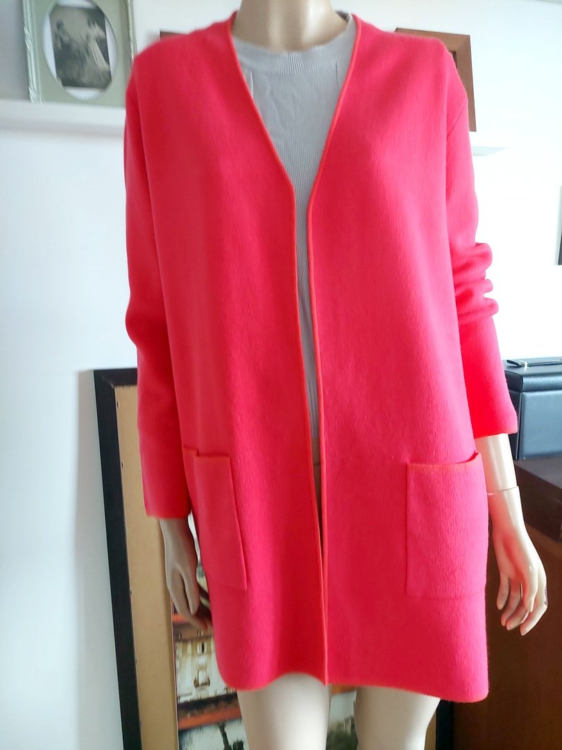 sweter marki Anni for friends. fason prosty z kieszeniami na dole. Materiał mięsisty 47% wiskoza 28% poliester 25% poliamid. cena sklepowa ponad 100 euro. rozmiar z metki 44. kolor koralowy. Na manekinie o rozmiarze małe 38, stan super. Podaję wymiary mierzone na płasko;