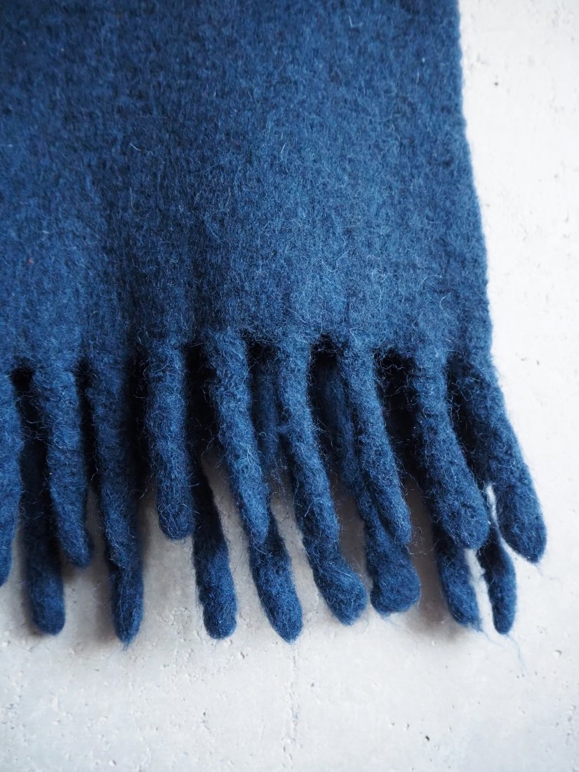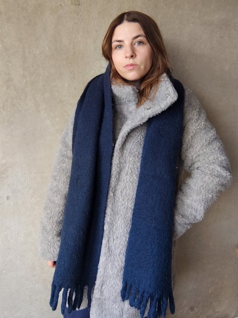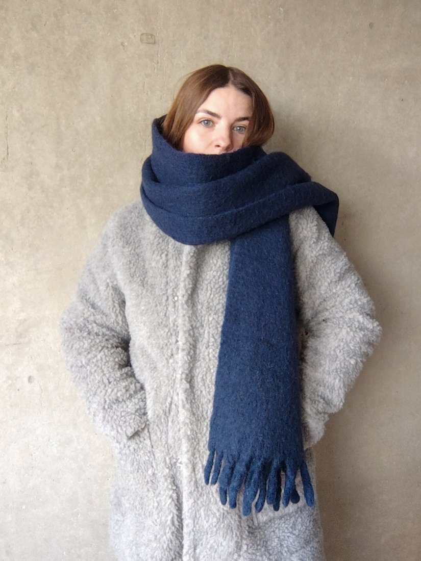 Dzięki zabiegowi filcowania szalik jest grubszy, a przez to cieplejszy i bardziej wiatroszczelny. Przypomina grube szale marki Acne.